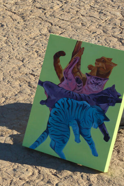Sasha Mosquera is an interdisciplinary artist whose work is grounded in personal experience and her love of cats. She uses the feline form as an entry point to create playful and colorful images that reflect emotions or ambiguity. Sasha paints portraits that depict how cats live between worlds, both in domestic and wild environments. As an artist living in Las Vegas, Sasha is inspired by the community cats that surround her and her work is therefore directly influenced by their personalities and nature. The colors in her work are inspired by the painter Quinquela Martin.
