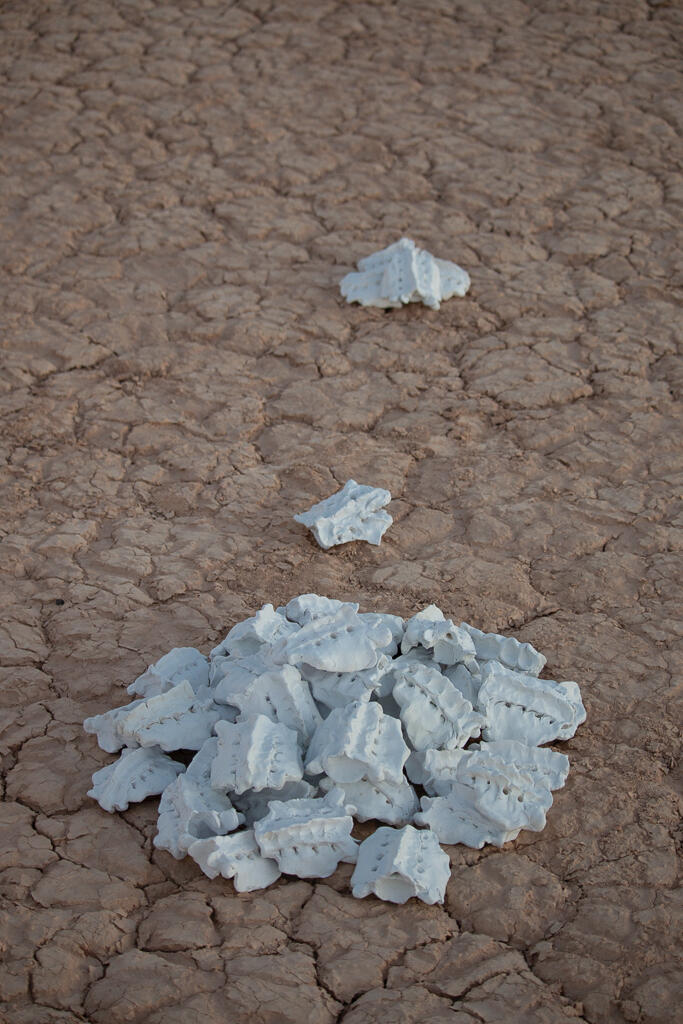 "Disposable Sacra" is a long-term meditation on the sacrum, said to be the site of the root chakra and the source of our life force, but also the source of my greatest pain. The piece reflects both reverence in the care required to mold so many sacra and society's indifference to women's pain.